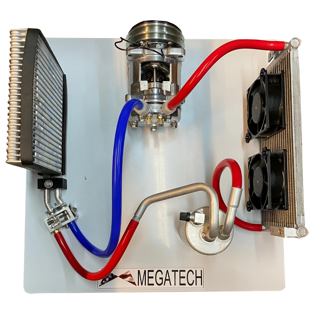Visualize AC compressor technology with a comprehensive cutaway display. The Automotive Air Conditioning System Cutaway showcases four different compressor types, including rotary scroll, variable displacement, and axial alternative compressors. This cutaway model allows students to see the operation of internal components and understand the mechanical differences among compressor technologies used in modern vehicles.