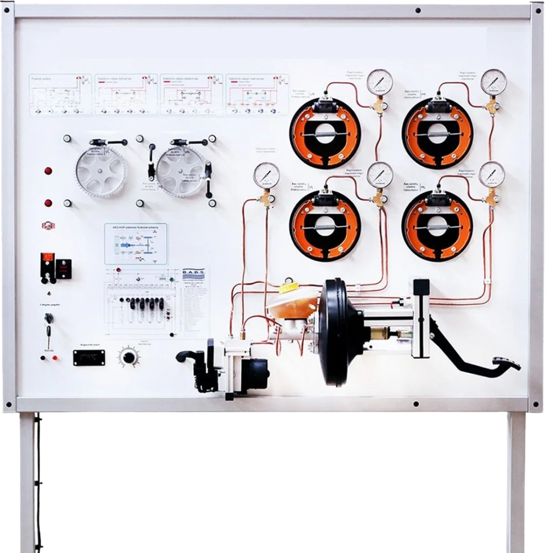 The Four Wheel ABS Trainer (MEGABS4) provides hands-on instruction in four-wheel anti-lock braking system operation using a functional BOSCH 5.3 ABS system integrated with original hydraulic brake components. Built on a mobile aluminum frame, this trainer allows students to study system behavior, hydraulic circuit interaction, and electronic control strategies in a realistic lab setting.
