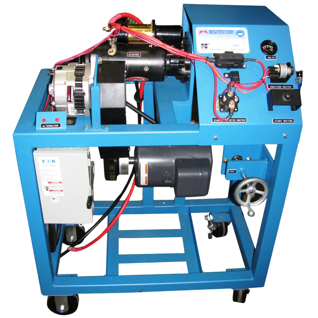 The Heavy Duty Starter/Charger Trainer (MEG690) provides hands-on instruction in diagnosing and servicing heavy-duty vehicle charging and cranking systems. Built with Delco Remy OEM components, this trainer replicates real-world electrical systems used in commercial and industrial applications. Students perform real-world electrical measurements and voltage drop testing to evaluate starter motor performance, alternator output, and battery system operation. Designed for heavy-duty electrical system training, the platform supports structured diagnostic exercises and fault identification.