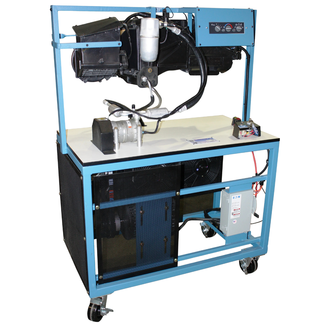 The Manual Air Conditioning Trainer provides comprehensive hands-on instruction in automotive air conditioning service using a fully operational manual AC system. Powered by a 5 HP electric motor that drives an authentic automotive compressor, this trainer replicates real-world AC operation without requiring a running engine. Students work with a complete refrigerant circuit, including condenser, evaporator with blower motor, fixed orifice tube expansion device, and pressure cycling switch—all authentic components found in manual AC systems. The integrated sight glass allows visual observation of refrigerant phase changes and bubble formation, teaching students to identify proper charge levels and system conditions. Pre-assembled and pre-charged with R134a refrigerant, this trainer is ready for immediate use while also allowing students to practice recovery, evacuation, and recharging procedures. The included manifold gauges, charging hoses, and battery cables provide everything needed for professional AC service training. Students learn to diagnose system performance, check for refrigerant leaks, replace faulty components, and service AC parts using industry-standard procedures.