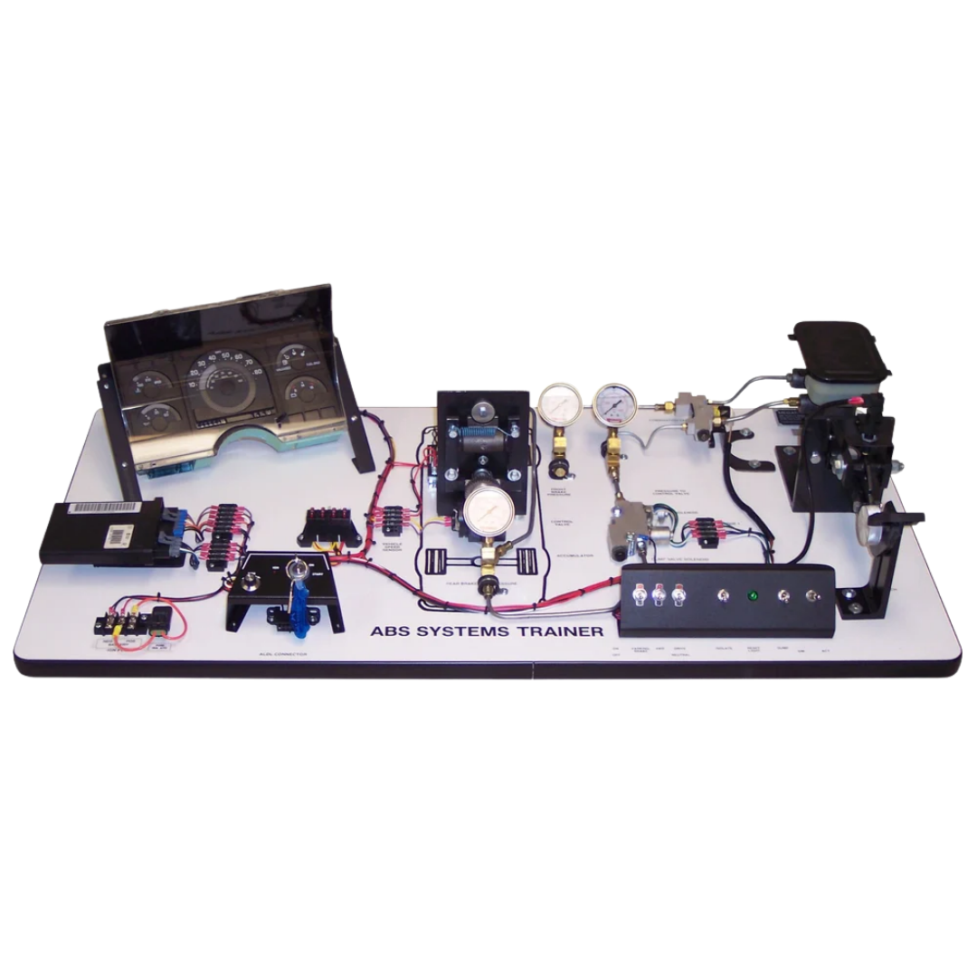 The Two Wheel ABS Trainer (MEGABS2) is designed to demonstrate the structure and operation of a two-wheel anti-lock braking system commonly used in truck and tractor applications. This trainer uses an actual rear wheel ABS system based on GM components, providing students with exposure to OEM-style architecture and functionality.